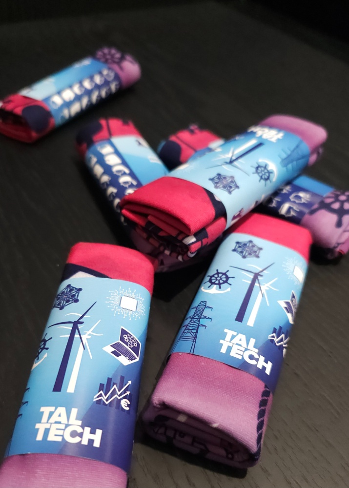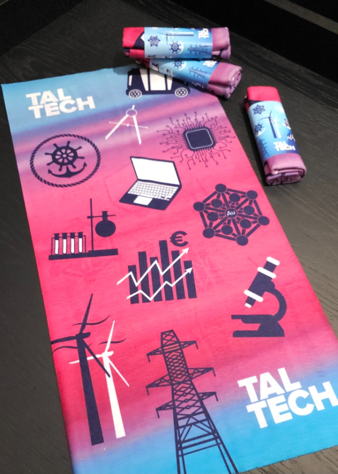Seamless single layer buff with Taltech faculty symbols. This colorful buff is wrapped in a cute roll held by a paper sleeve, which, in addition to the beautiful design, also has examples of usage from a scarf and headband to different hat options. It is ideal for sports or cyclingenthusiasts and peaple with active lifestyle.
