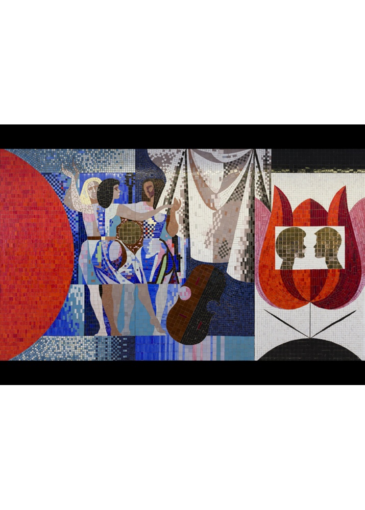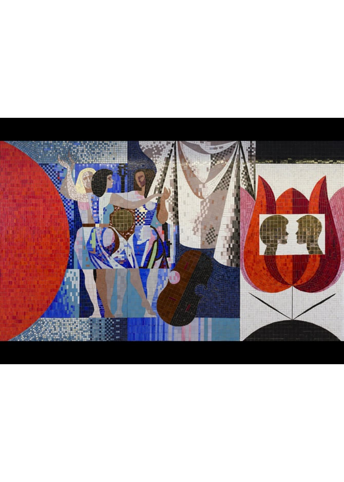 The postcard shows a fragment of Enn Põldroos's mosaic "Youth". The mosaic panorama is a colorful composition with an artistic design characteristic of the era of the Estonian painter Enn Põldroos. The mosaic was made in 1969 and is located on the wall of the lobby of the TalTech main building.