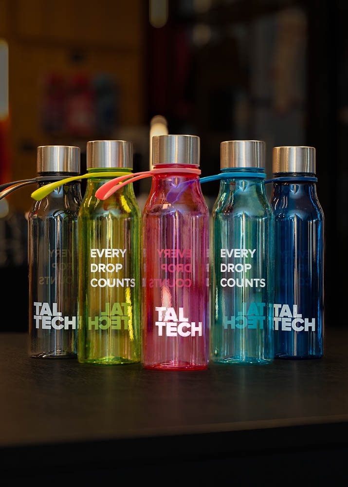 - TalTech logo and the slogan "My favourite cocktail is H2O" printed on the bottle