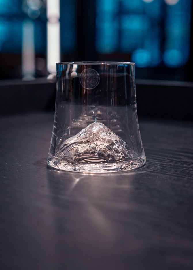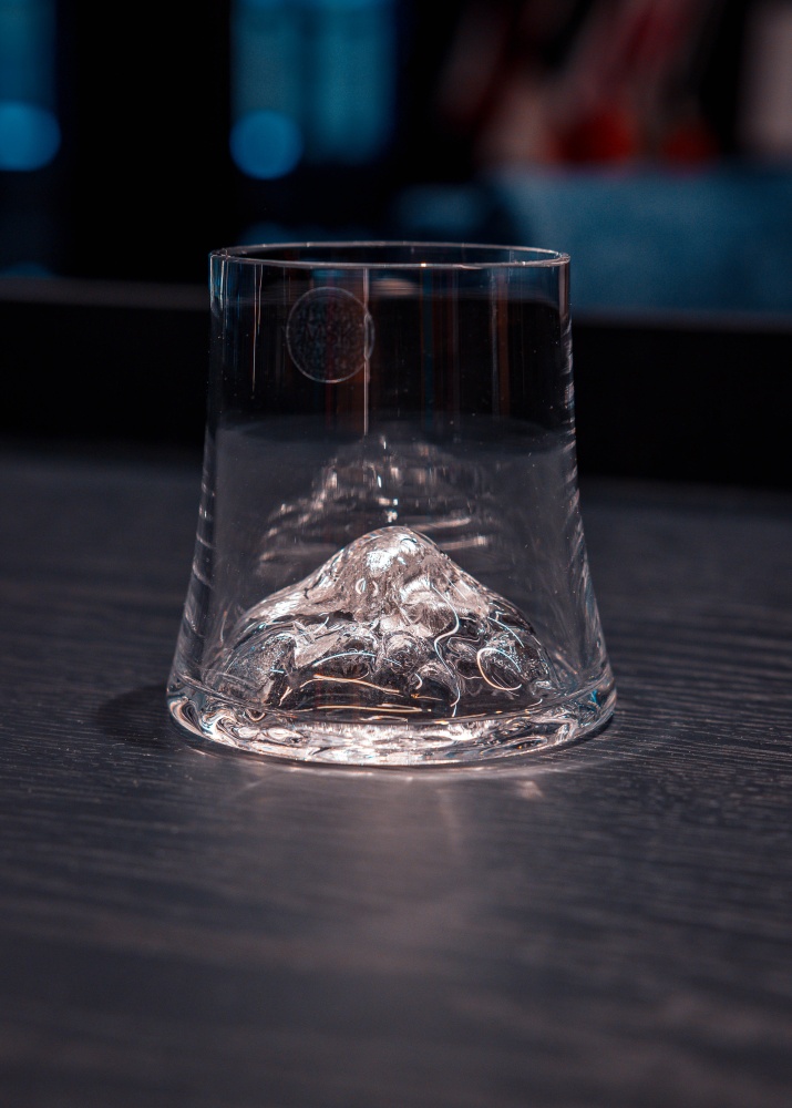 Estonian handmade whiskey glasses are beautiful and glamorous for both gifting and admiring on the shelf. Perfect for a whiskey-gourmet. At the bottom of the glass is pressed with a wooden form to look like a mountain. The mountain symbolizes our will and grit to pursuit to the very top. A silver sheet at the bottom adds more color and effect to the glass.