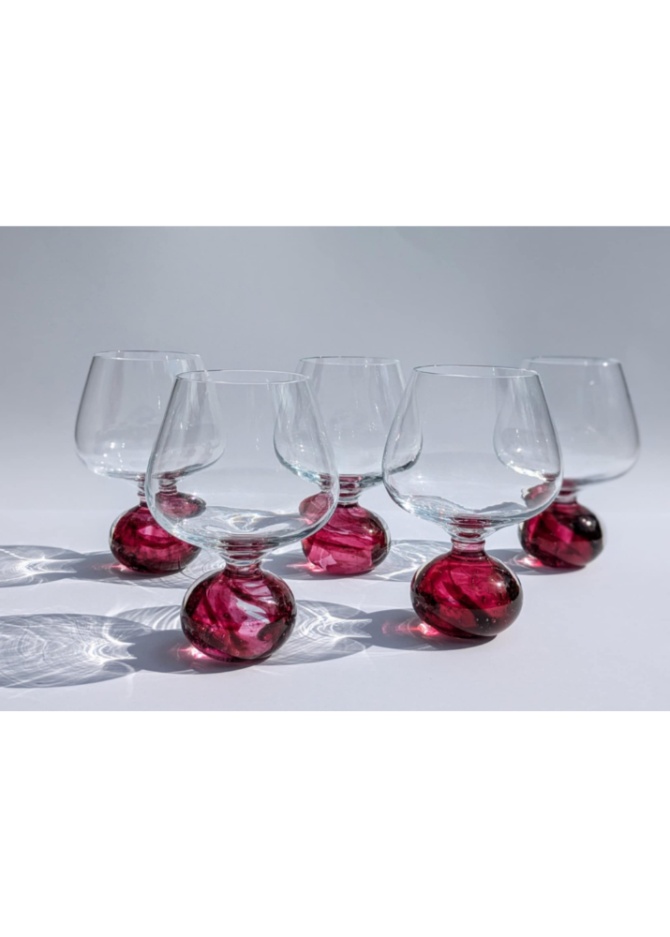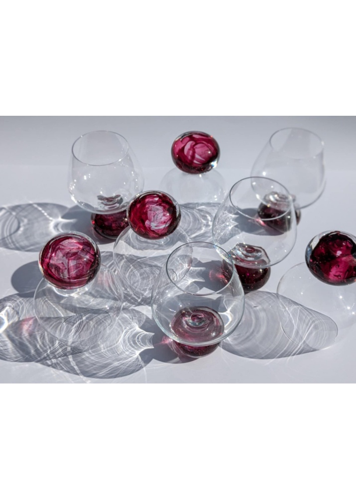 ISAAC is a wine glass, its dignified and magnificent form ensures its durability over time, but at the same time it also contains a bit of humor and sparkle - celebration and partying! The foot of the glass, whose shape is inspired by Newton's apple. Transparent and wine-pink flowing luxurious glass mix is creating flowing and shimmering reddish tones that emphasize the depth of the color of red wines especially well. The glasses are the work of an artist and handmade. Every glass have their own personality and each one is unique.