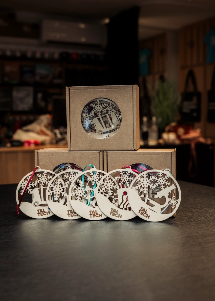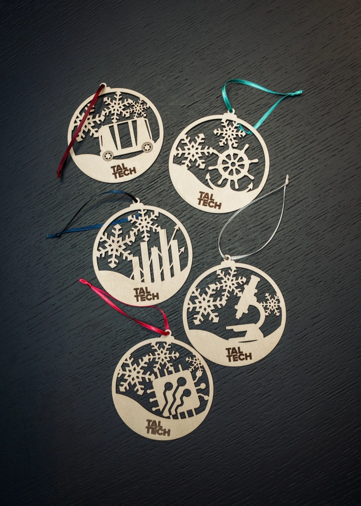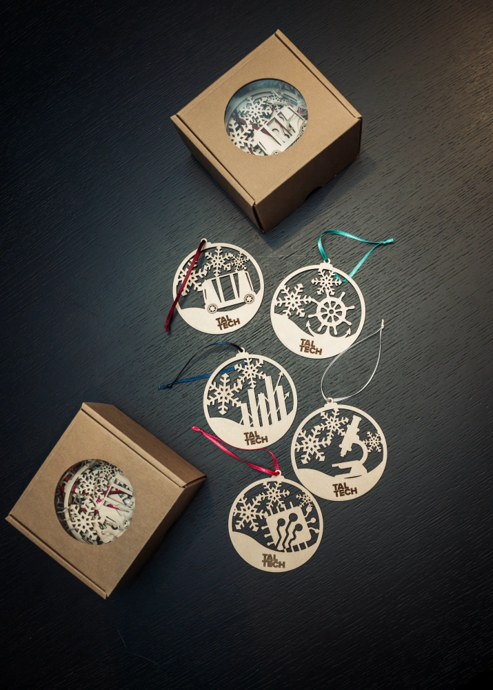 Eestis valmistatud vineerist jõuluehete komplekt ühendab loodussõbraliku materjali ja TalTechi kodused teaduskonnad. Iga ehe on laseriga täpselt lõigatud, tuues esile puidu loomuliku soojuse ja ülikooli teaduskondade sümboolika, mida raamivad kaunid lumehelbed. Komplektis on 5 unikaalset ehet, millest igaüks jutustab oma väikese loo – inseneri ideedest, majanduse loovusest, loodusteaduste täpsusest, mere julgusest ja IT innovatsioonist.