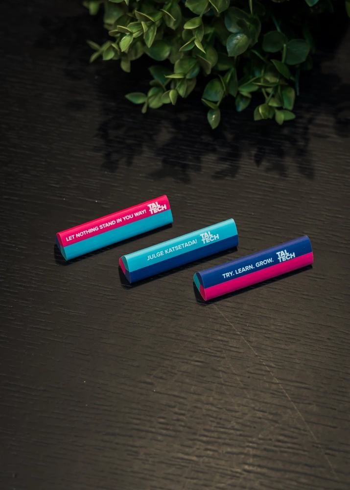 Värviline kustutuskumm teeb rõõmsaks nii koolilapse, tudengi kui ka hariliku armastaja kolleegi. TalTechi brändivärvides särav kustutuskumm on mugava kolmnurkse kujuga ning peab vastu paljudele parandustele. Igal küljel on erinevad innustavad sõnumid, et suunata sind katsetama ja mitte kartma vigu teha.